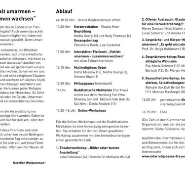 Wir möchten dazu ermuntern, die Offenheit und Neugier aufeinander, auf unterschiedliche Religionen und Glaubensrichtungen, wachsen zu lassen. Wir laden zum Austausch darüber ein, was wir glauben und wie wir gemeinsam unsere Gesellschaft gestalten wollen. So lernen wir uns als...