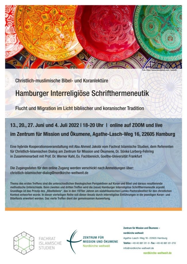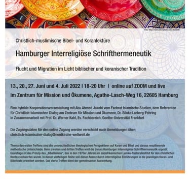 Thema des ersten Treffens sind die unterschiedlichen theologischen Perspektiven auf Koran und Bibel und daraus resultierende methodische Unterschiede. Beim zweiten und dritten Treffen wird die (neue) Hamburger Interreligiöse Schrifthermeneutik erprobt. Grundlage ist das Prinzip des...