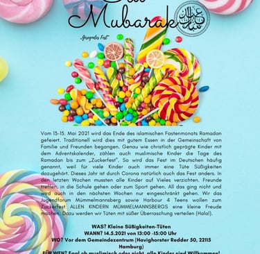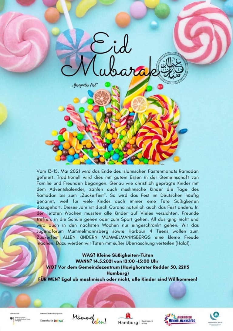 Harbour 4 Teens sowie das Jugendforum wollen zum Zuckerfest allen Kindern Mümmelmannsbergs eine kleine Freude machen. Es werden Tüten mit süßer Überraschung verteilt! Wann: 14.5.2021, 13:00 -15:00 Uhr, wo: Vor dem Gemeindezentrum (Havighorster Redder 50)