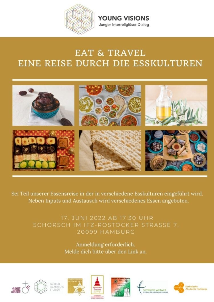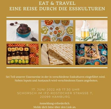 Einladung: Sei Teil unserer Essensreise in der in verschiedene Esskulturen eingeführt wird. Neben Inputs und Austausch wird verschiedenes Essen angeboten. Wann: 17. Juni ab 17:30 Uhr im SCHORSCH im IFZ, Rostocker Straße 7, 20099 Hamburg. Melde dich bitte über den Link an...