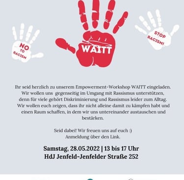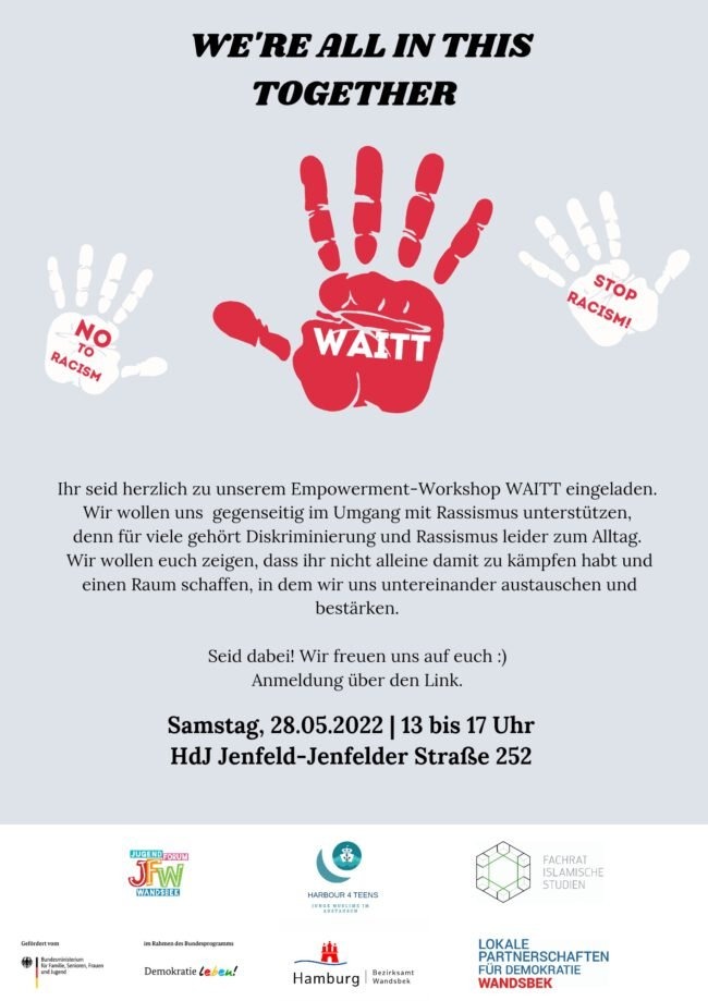 Einladung: Am 28. Mai veranstaltet unser Projekt-Team von Harbour 4 Teens einen Empowerment-Workshop unter dem Titel "WAITT - We're all in this together". Neben einem Austausch erwartet Euch ein spannender Gast und ein Slam. Sei dabei! Anmeldung unter: ...