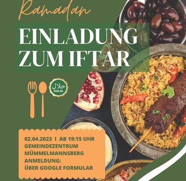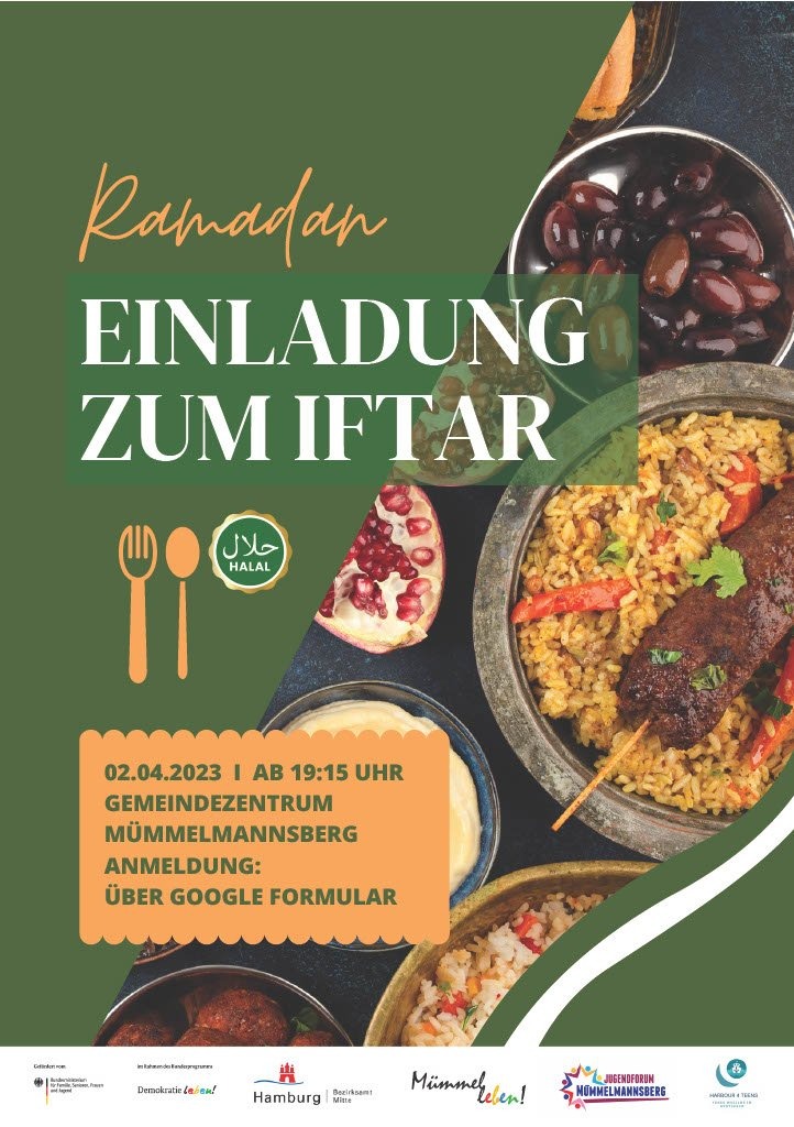 wir laden Sie herzlich zu unserem Iftar im Gemeindezentrum Mümmelsmannsberg ein. Das Iftar wird vom Jugendforum Mümmelmannsberg und Harbour4tens veranstaltet und findet am Sonntag, den 02.04.2023 um 19:15 Uhr statt.