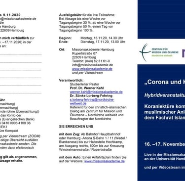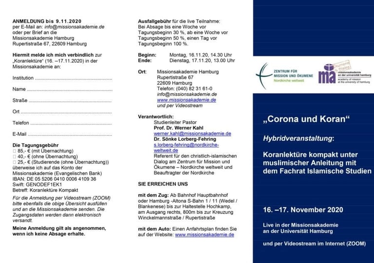 Die Missionsakademie an der Universität Hamburg bietet in Kooperation mit dem Zentrum für Mission und Ökumene - Nordkirche weltweit und dem Fachrat Islamische Studien ein Kompaktseminar zur Koranlektüre an. Das Angebot richtet sich an alle Interessierten.