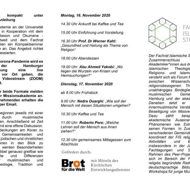 Interessierte für beide Formate melden sich bitte in der Missionsakademie an. Die online Teilnehmenden erhalten die Zugangsdaten per Email.