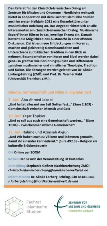 "Glaube, Gemeinschaft und Nähe in digitaler Zeit": Muslimische Expert*innen führen in das Thema ein. Danach besteht die Möglichkeit zum Austausch. Dabei können neue Entdeckungen im Koran gemacht und Gemeinsamkeiten und Unterschiede zur biblischen Tradition...