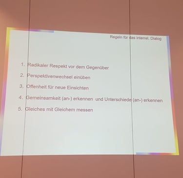 Die Veranstaltung wurde mit einer kurzen Vorstellung des Tages eingeleitet. Danach wurde ein kurzer Abschnitt aus dem Koran vorgelesen. Im Anschluss wurde gesungen und zum Schluss fand eine Fishbowl-Diskussion statt. Nach der Einführung begann die Mittagspause, bei der verschiedene Spezialitäten aus den unterschiedlichen Kulturen angeboten wurden.