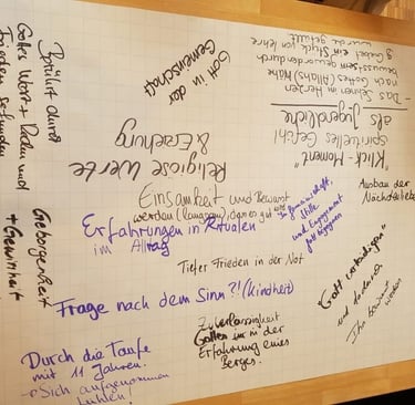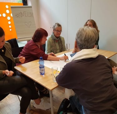 Der Workshop #unteilbar wurde seitens des FIS von Merve Dursun, Diana Hashimi und Madiha Nisar sowie von weiteren drei christlichen jungen Frauen gestaltet. In diesem Workshop wurden mithilfe der World-Café-Methode drei Fragen bearbeitet. Eine hiervon lautete z.B. „Siehst du Gemeinsamkeiten in den Gottesbildern der unterschiedlichen Religionen?“. Es wurden drei Tische aufgestellt mit je einer Frage und einer Tischmoderatorin, die das Gespräch einleitet, die Frage vorstellte und eventuell noch erklärte. Die Fragen wurden an jedem Tisch von je vier Frauen bearbeitet. Am Ende wurden die Ergebnisse festgehalten, die die Frauen während der Tischdiskussionen auf ein großes weißes Blatt notiert haben. Die gesamte Diskussion wurde von einer Power-Point-Präsentation begleitet. Es kamen wunderbare Ergebnisse dabei heraus, denn man verspürte eine Gemeinsamkeit während der gesamten Zeit der Diskussion. Es war eine sehr schöne, lehrreiche und lebendige Diskussion zwischen den Frauen. Der Frauenbegegnungstag war sowohl für die Teilnehmerinnen und auch für das Interreligiöse Frauennetzwerk eine gelungene und interessante Veranstaltung. Zum Ende des Tages waren glückliche und dankbare Gesichter zu erkennen.