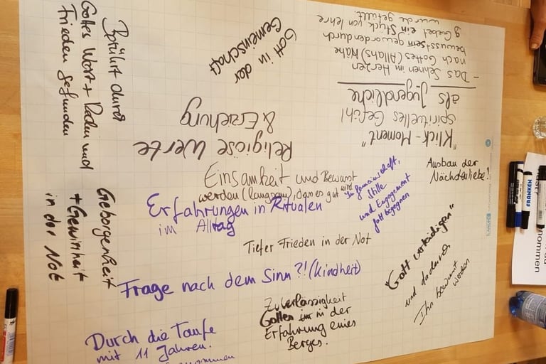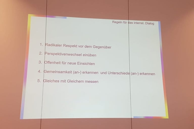 Nach der Mittagspause wurden die Workshops vorgestellt. Es gab sieben Workshops: „Interreligiöse Konfliktlösungen“, „Kreativ-Workshop ‚malend zueinander finden‘”, „das Absolute ist unteilbar – Gemeinsamkeiten in den Religionen“, „#unteilbar“, „Innerer Frieden durch Meditation und Gebet“, „aktiv für Menschenrechte“ und „Interreligiöse Singen“. In den Workshops konnten die Teilnehmerinnen in Gruppen zusammenarbeiten, diskutieren und sich austauschen.