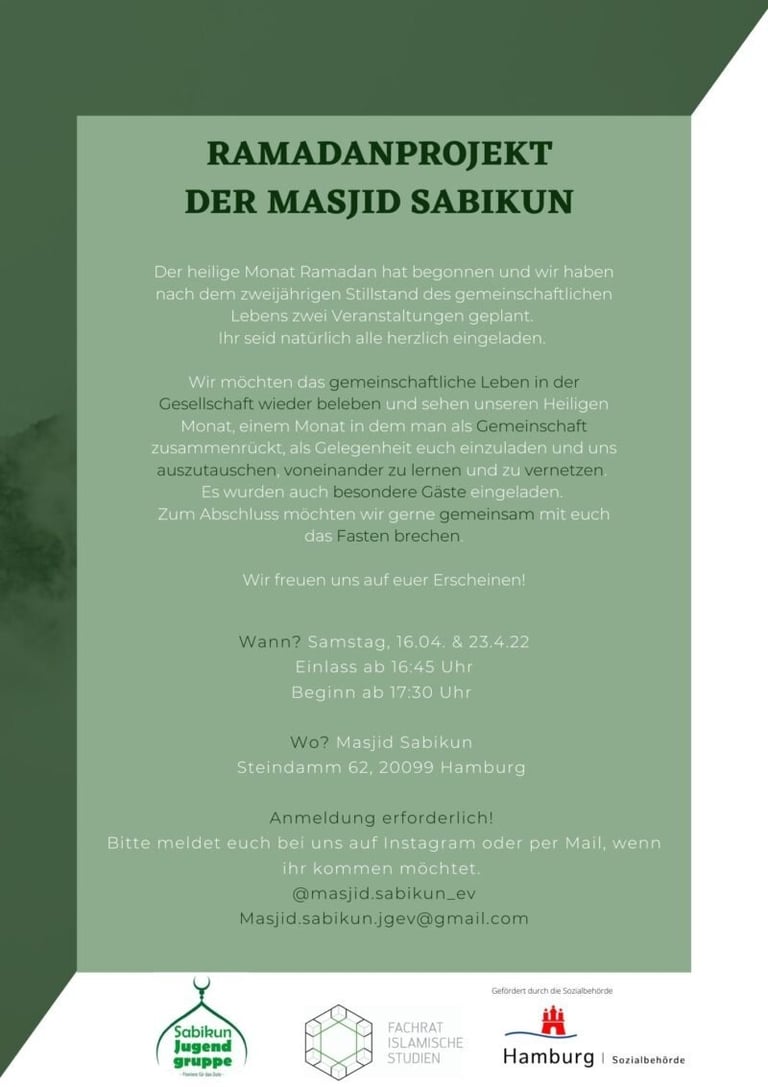 Anlässlich des Fastenmonats Ramadan veranstalten wir gemeinsam mit der Jugendgruppe der Sabikun-Moschee zwei Iftar-Veranstaltungen. Am 16.4. und 23.4. laden wir herzlich zu einem interkulturellen und interreligiösen Programm mit gemeinsamen Essen...